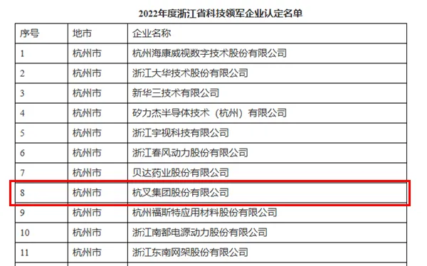 喜讯!杭叉集团荣获浙江省科技领军企业 -- 2023-02-02 -- 近日,浙江省科学技术厅发布2022年度浙江省认定科技领军企业、科技小巨人企业名单,凭借在科技创新方面的卓越表现,杭叉集团股份有限公司获认定为浙江省科技领军企业。 据悉,“科技领军企业”是指科技领军企业是指科技创新能力强,具有与之相适应的研发投入、研发人员,主导高新技术产品市场占有率位居全国或全球前列,具有较大经济规模和良好成长性的高新技术企业。科技领军企业是国家战略科技力量的重要组成部分,能发挥市场需求、集成创新、组织平台优势,打通从科技强到企业强、产业强、经济强的通道。 经过多年的持续创新,公司构建了“一核两翼、全面统筹”的技术创新体系,打造了行业领先的国家企业技术中心、国家认可实验室、国家级工业设计中心、国家级博士后科研工作站、浙江省工业车辆工程技术研究中心、杭叉智能工业车辆省级重点企业研究院、浙江省院士专家工作站等省级以上技术创新平台,持续高效研发并向市场导入系列化新能源及智能化工业车辆,引领行业创新发展。 此次入选科技领军企业,是对杭叉集团创新能力以及发展水平的肯定,公司将以此为契机,持续加大研发投入,加强创新型人才队伍建设,以“智能化、绿色化、服务化”为技术创新发展方向,围绕“人工智能、新能源、5G、物联网”等开展关键核心技术攻关,增强企业核心竞争力,打造更有影响力、更具引领性的标杆企业,助力浙江省科技创新高质量发展。