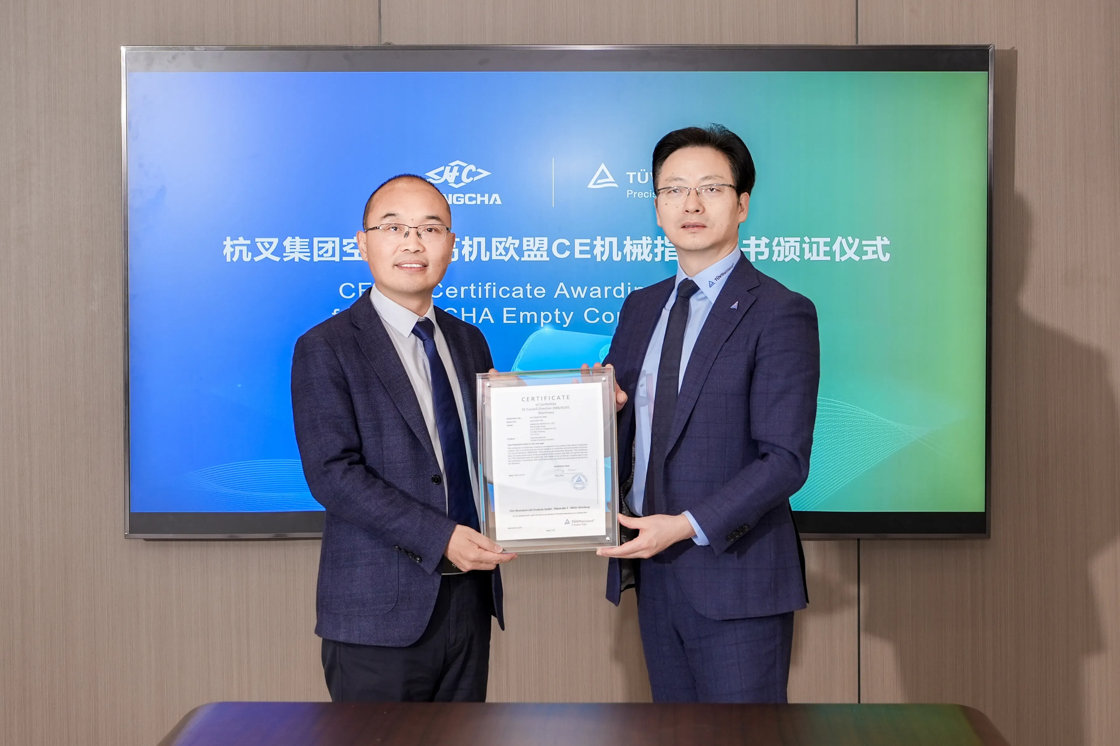 会上,双方正式签署战略合作协议,TüV莱茵向杭叉集团颁发了空箱堆高机欧盟CE机械指令认证证书,进一步确认了杭叉在产品质量、安全性能及技术创新方面的行业领先地位。