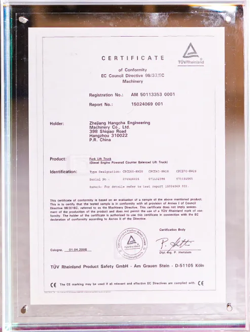 TüV莱茵2008年为杭叉颁发首张叉车欧盟CE机械指令认证证书