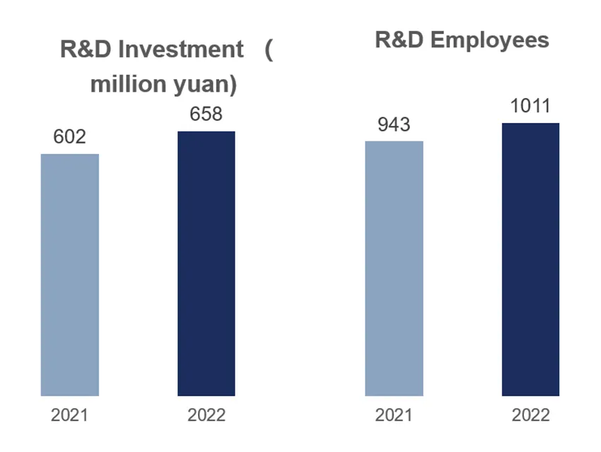 R&D investment of 658 million yuan ($97.8 million), up 9.28%, accounting for 4.56% of the revenue; 1,011 R&D personnel, up 7.22%, accounting for 18.36% of the total employees of the company.