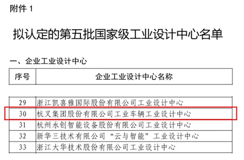 Recently, the Ministry of Industry and Information Technology of China issued a document to publicize the list of the fifth batch of national industrial design centers. The Industrial Design Center for Industrial Vehicles of Hangcha Group was successfully recognized. After being awarded as the National Enterprise Technology Center and the National Post-doctoral Dcientific Research Workstation, Hangcha Group again is approved as the National Innovation Platform.