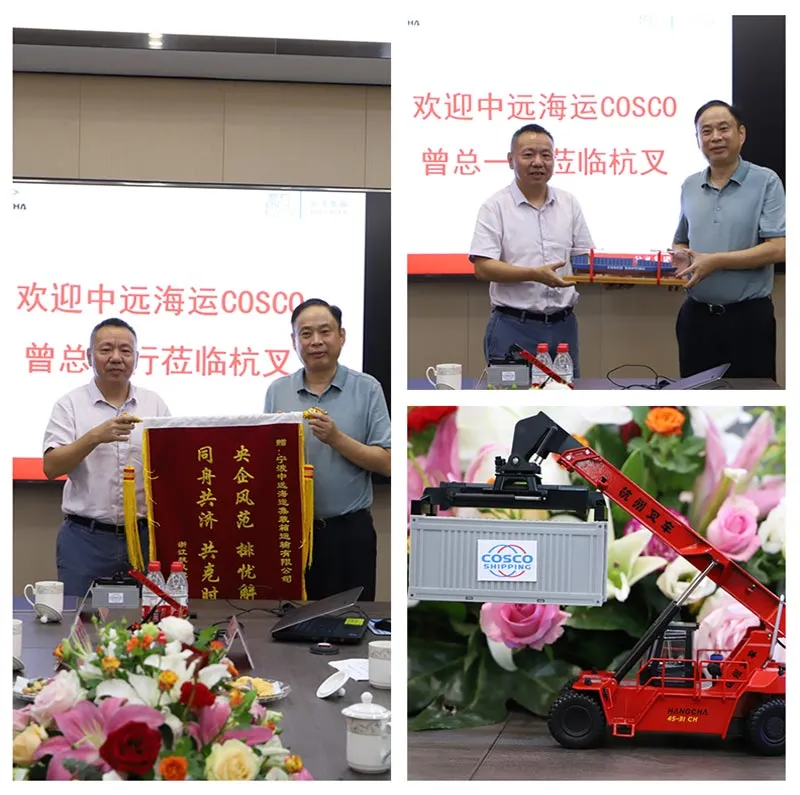 On September 10th, Zeng Zhaomin, General Manager and Chen Weijiang, Deputy General Manager of COSCO Shipping Lines Co., Ltd., of Ningbo branch, and Yang Liang, General Manager of Hangzhou Branch, visited and had a deep exchange with Hangcha Group. Zhao Limin, the chairman and general manager of Hangcha Group, Chen Saimin, the secretary of the board, Wu Jianxin, the general manager of Hangcha Import and Export Co., Ltd. , and the deputy general manager Zhang Junjun attended the meeting.
