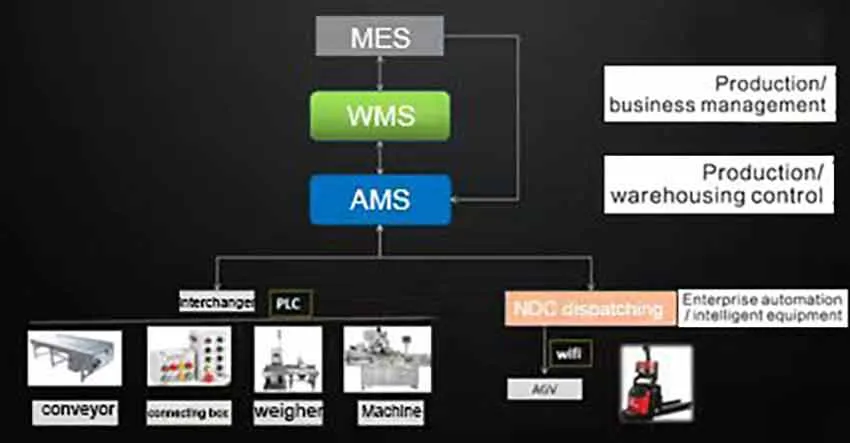 2T mini stacking AGV+ 3T heavy stacking AGV+ 4.5T Flatbed AGV+MES system +WMS system + intelligent charging pile.