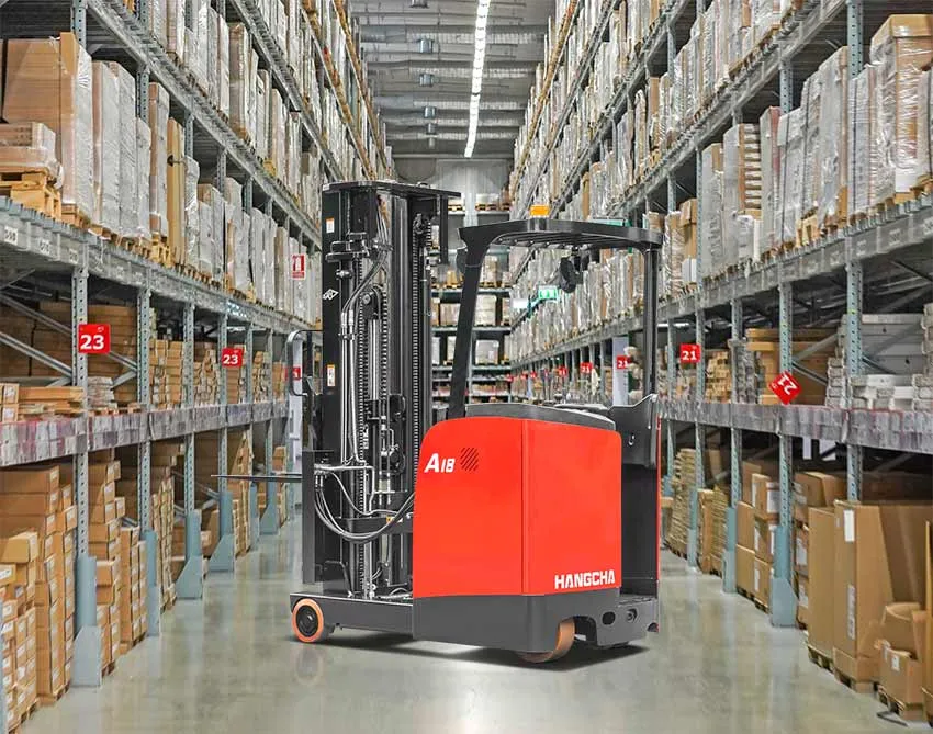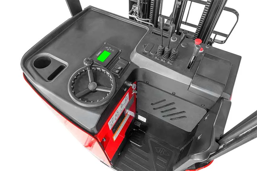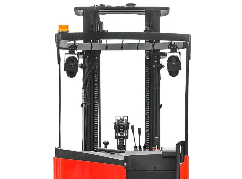 Feature: A series stand-on reach truck is a new-generation product developed by our company in response to different market needs. The truck has comfortable ergonomics, wide operating vision and a stable control system.