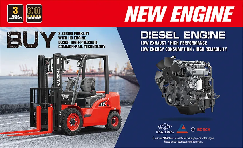 HANGCHA 1.5-3.5t X series diesel engine forklift with high-pressure common-rail technology features the following benefits: Low energy consumption, low exhaust, low noise, high performance, high reliability, easy maintenance. All the advantages are benefit by BOSCH’s high-pressure common-rail technology that has been a mature technology in industrial vehicles.