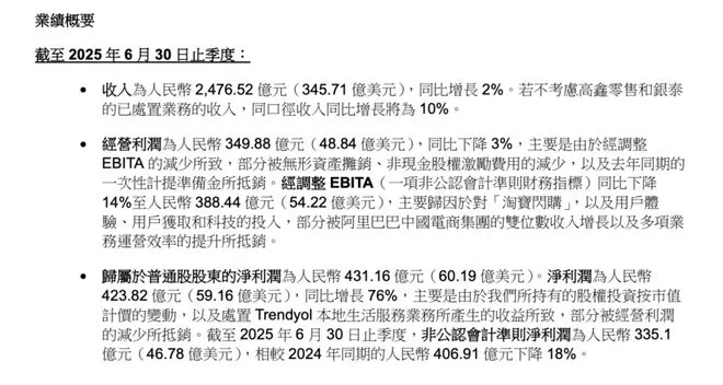 8 月 29 日,阿里巴巴对外公布 2025 年第二季度财报。当季阿里巴巴营收 2476.52 亿元,同比增长 2%。剔除出售高鑫零售及银泰业务影响,当季阿里巴巴同口径收入同比增长 10%。